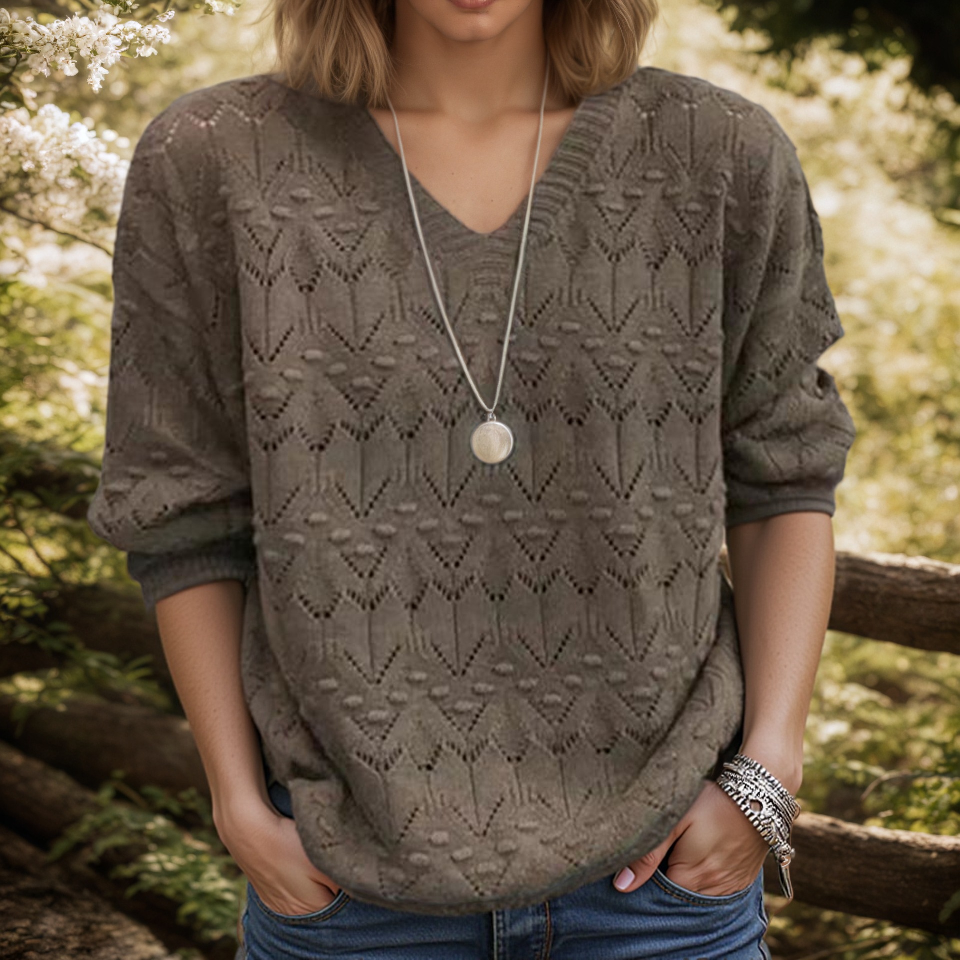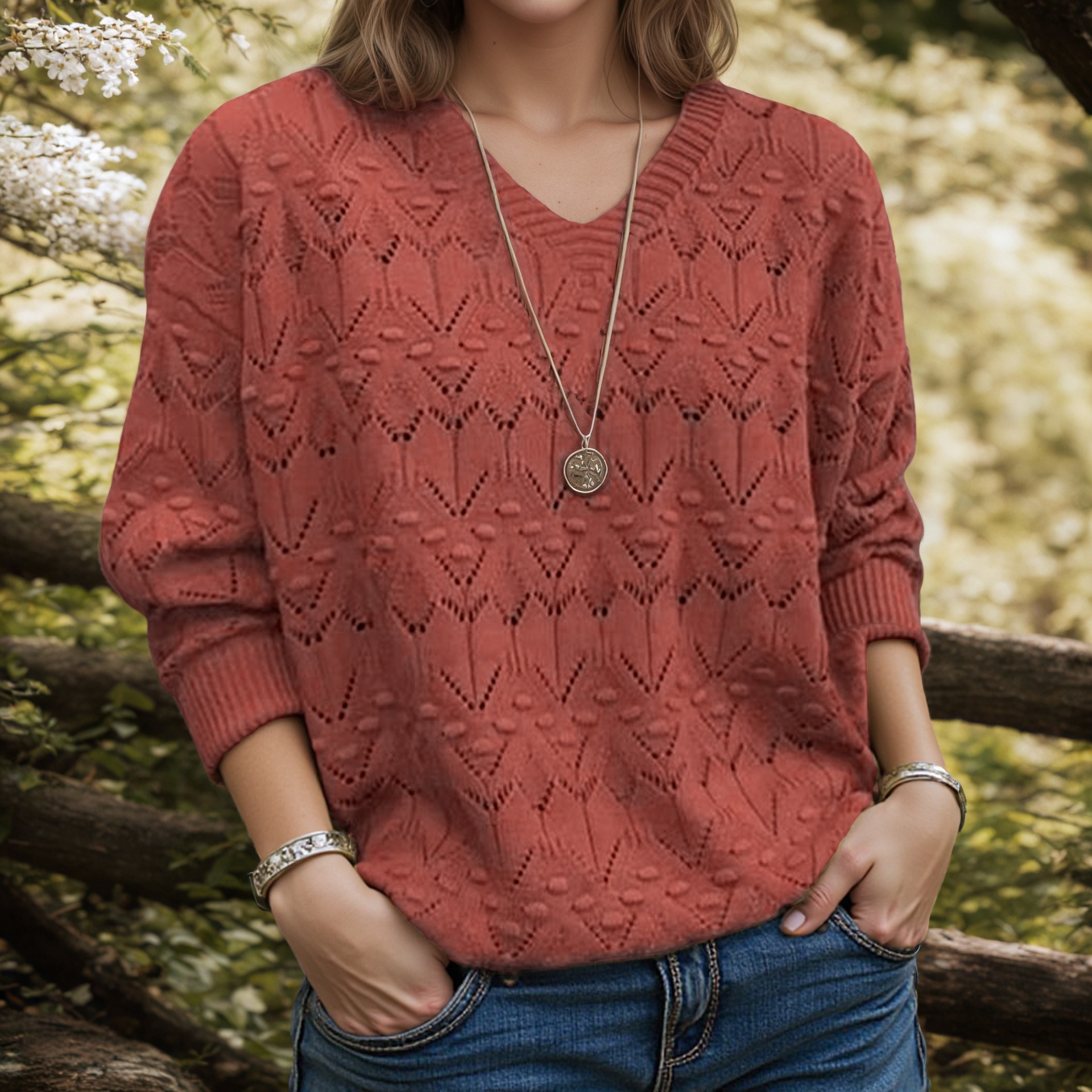 V-neck long sleeved solid color top with hollowed out pullover sweater for women